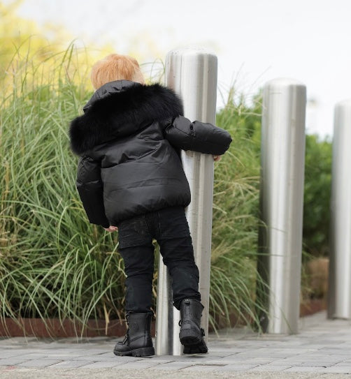 The Pramie Black Jacket with Blue Trim is the perfect choice for keeping your active kids warm and stylish. This jacket features a fur-trimmed hood and is down-filled for maximum insulation. The bright blue zipper adds a pop of color to this practical and durable coat.